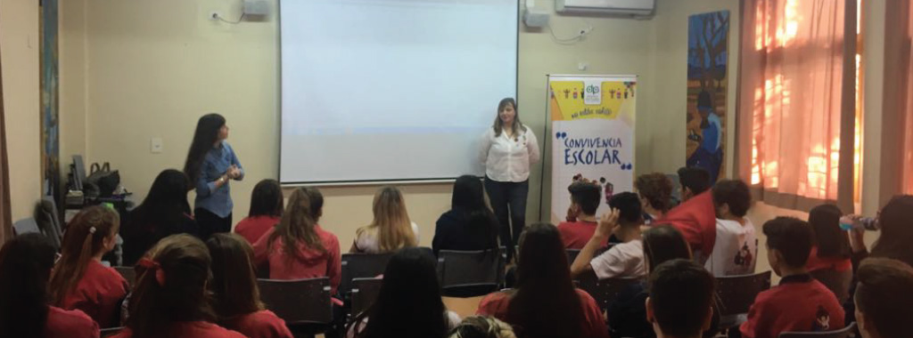 En la Escuela, el equipo que conduce Mónica Bornia, junto a Antonela Manchini, Jorge Ulianow y Daniel Lema, se entrevistaron con el director del Colegio, Rafael del Campo, y con la trabajadora social a cargo del espacio de convivencia, Pamela Padovani, previo al desarrollo del taller que incluyo proyección de videos que presentaron situaciones de violencia en diferentes espacios, para posteriormente hacer un trabajo lúdico e introducir y sensibilizar a los chicos en un espacio de diálogo.