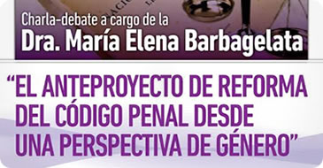 La perspectiva de género en el anteproyecto de reforma del Código Penal, será el eje de la charla debate que dará María Elena Barbagelata, integrante de la Comisión formada a tal fin, organizada por la Defensoría del Pueblo de la provincia de Buenos Aires, el Instituto de Cultura Jurídica, y el Centro Interdiciplinario de Investigaciones