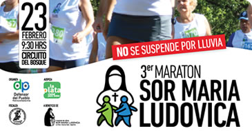 La Defensoría del Pueblo de la provincia de Buenos Aires organiza la tercera edición de la maratón "Sor María Ludovica", que tendrá lugar el domingo 23 de febrero, desde las 9,30, en el Circuito del Bosque de La Plata. Para anotarse, hay tiempo hasta el viernes 21 de febrero en la sede de la Defensoría del Pueblo, en Avenida 7 N° 840